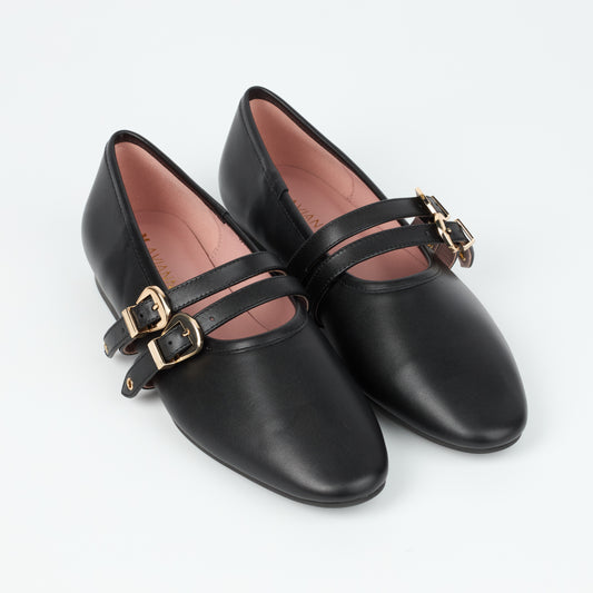 Dover Black Leather Flat with Double Strap Detail