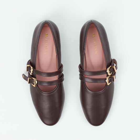Dover Brown Leather Flat with Double Strap Detail